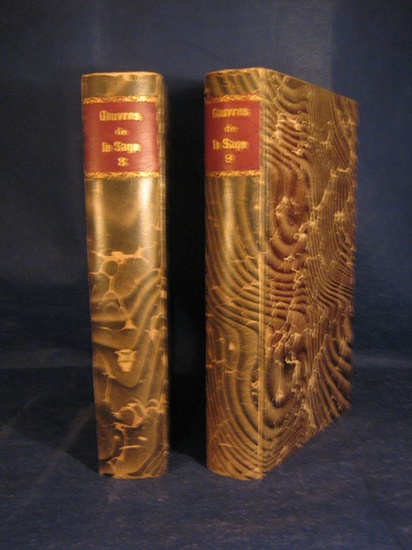 Nouvelle Traduction De Roland L'amoureux, De Matheo Maria Boyardo, Comte Di Scandiano, 2 tomes. Avec Figures (= Oeuvres choisies de le Sage. Avec figures, tomes 8 - 9). Amsterdam / Paris, Rue et Hotel Serpente, 1783. 430, 397 S. Marmorierter Pbde. der Zeit mit goldgeprägtem Rückentitel auf rotem Rückenschild. Mit 4 ganzseitigen Kupfern sowie sehr schönen Textvignetten (avec 4 gravures pleine page; with 4 full-page engravings). Alain-René Lesage (1668 -1747) zählt zu den erfolgreichsten Autoren des sich um 1700 herausbildenden Literaturmarktes. Als sein bekanntestes Werk gilt seine zwischen 1715 und 1735 in vier Bänden erschienene Histoire de Gil Blas de Santillane (Geschichte des Gil Blas von Santillana). Sehr gutes Exemplar; Seiten sauber und weitestgehend fleckenfrei (allenfalls wenige Seiten leicht fleckig). Très bon copie, pages blanches et surtout sans taches (tout au plus quelques pages légèrement taché). Weitere Fotos auf der Homepage des Antiquariats (bitte Art.-Nr. auf der Angebotsseite in das Suchfeld eingeben).