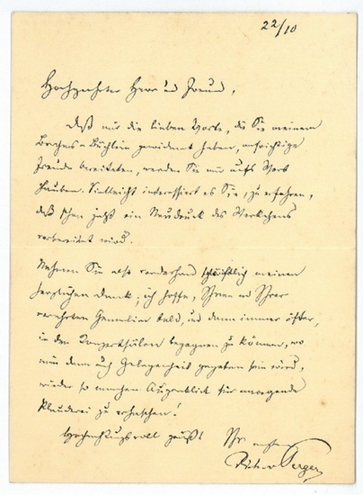 Eigenh. Brief mit U. O. O. u. D. 1 S. 8vo. Beiliegend Zeitungsausschnitt. Bedankt sich bei einem Freund für dessen Widmung in einem Buch. - Richard von Perger war von 1895 bis 1900 Konzertdirektor der Gesellschaft der Musikfreunde in Wien, deren Konservatorium er 1899-1907 als Direktor leitete.