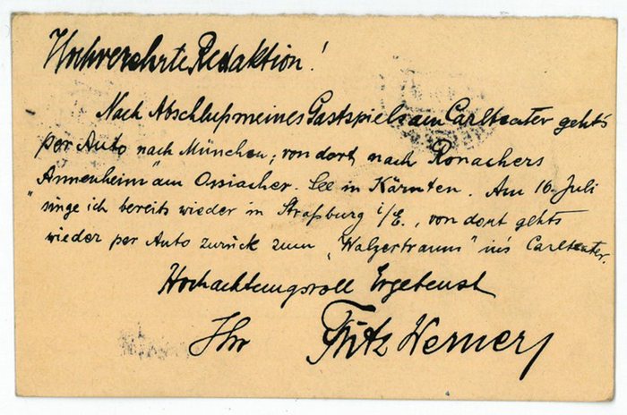 Eigenh. Postkarte mit U. [Poststempel: Wien, 31. XI. 1907]. 1 S. Qu.-8vo. An die Redaktion des "Wiener Salonblattes": "Nach Abschluss meines Gastspiels am Carlteater [!] geht's per Auto nach München; von dort nach Ronachers 'Annenheim' am Ossiacher-See in Kärnten. Am 16. Juli singe ich bereits wieder in Strassburg, von dort geht's wieder per Auto zurück zum 'Walzertraum' ins Carltheater [?]".