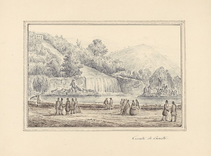 Cascata di Caserta. _. Feder in Braun und Blau, mit vier braunen Tuschlinien umrandet, auf Velin, rechts unten bezeichnet ?Marina di Palermo?. Darstellungsgröße 13,5:20,1 cm, Blattgröße 22,1:32,8 cm. ?Über die Lebensumstände des in Neapel nachweisbaren Vedutenzeichners Antonio Senape ist sehr wenig bekannt. Seine Blätter sind durch gelegentliche Signaturen und ihren ziemlich gleichbleibenden Stil gesichert. Die Verwendung von zwei verschiedenen Tinten (oder Feder und Bleistift) zur Erreichung einer Fernwirkung scheint charakteristisch für Senapes Zeichentechnik zu sein. Das Museo Nazionale di San Martino in Neapel besitzt von ihm einige große Panoramen [...] Senapes Themenwahl war übrigens keineswegs auf die Gegend um Neapel beschränkt [...]? (zit. aus Ausst. Katalog: Neuerwerbungen. Staatliche Graphische Sammlung München. München 1982, Nr. 58, Abb. 33 vgl. auch Katalog 17, Aquarelle und Handzeichnungen, Galerie Joseph Fach, Frankfurt a.M., 1979, Nr. 195 und 196).