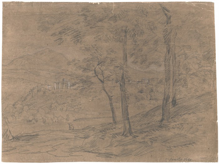 Nemi, Blick vom Waldrand auf die Ortschaft mit dem Kloster Santo Vito. _. Schwarze und weiße Kreide, über Bleistift, auf braun grundiertem Bütten, rechts unten Reste der Signatur sowie bezeichnet ?Santo Vito Nemi?. 25:34 cm. Provenienz: Nachlaß des Künstlers; Sammlung Einsele, nicht bei Lugt; Sammlung A. Caspari, Frankfurt a.M., nicht bei Lugt. Mit leichten Randschäden, Quetschfalte und Riß oben.