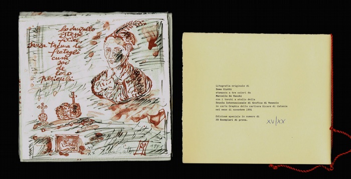 L'historia di Winfredo. Litografia originale a tre colori e calligrafata. Test trascritto e commentato da Gian Franco Grechi. litografia stampata da Marcello De Vecchi con i torchi a stella della Scuola Internazionale di Grafica di Venezia in carta Graphia della cartiera Sicars di Catania, nel mese di novembre, 1991. 8 S. Textheft mit Kordelbindung (14,9x17 cm); 12seitiges hs. signiertes und numeriertes Leporello (ca. 16,2x204,3 cm). No. XV/XX numerierten Exemplaren.