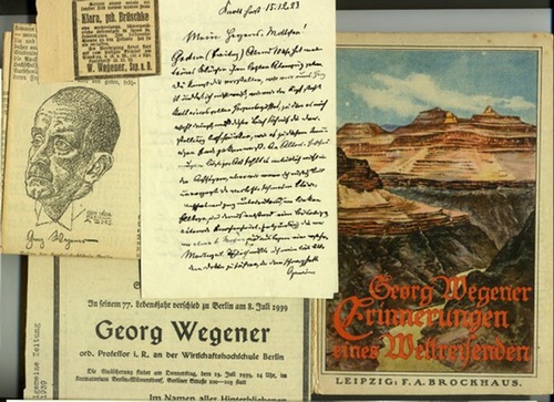 Erinnerungen eines Weltreisenden. Auszug aus 'Der Zaubermantel'. Mit beiliegenden Dokumenten zum Verfasser und seiner Familie. Leipzig: Brockhaus. 1921. (bestossen und etwas fleckig, Rückenkanten berieben und leicht eingerissen, papierbedingt leicht gebräunt, im Ganzen passabel erhalten). (= Reisen und Abenteuer 11) Erste Ausgabe dieser Kurzfassung. Anfangs mit siebenzeiliger, eigenhändiger Widmung des Vaters von Georg Wegener, dem Pfarrer von St. Georgen und Superintendenten Wilhelm Wegener. Dazu ein eigenhändiger, fast dreiseitiger Brief des Vaters zum Tode seiner Frau Klara, der Mutter von Georg Wegener, datiert vom Todestag, dem 15. Dezember 1923. Weiter dabei: die Todesanzeigen von Klara, Wilhelm und Georg Wegener, der Zettel für die Trauerfeier von Wilhelm Wegener, ein Zeitungsartikel über die Leiter Berliner Hochschulen (darunter Georg Wegener), sowie zwei Nekrologe zu Georg Wegener. Insgesamt ein intimer Einblick in die Familie des berühmten Reisenden.