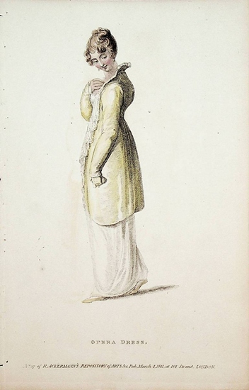 Damenmode 1810 er Jahre OPERA DRESS (=From: The Repository of arts, literature, commerce, manufactures, fashions and politics) London, Rudolph Ackermann, 1811. antiker Stich / antique engraving, Format ca. 21,5x13,8 cm. Ackermann's repository of arts.
