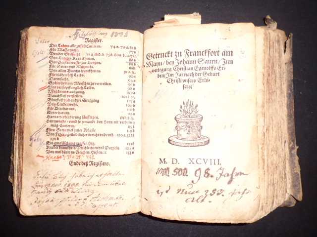 Thesaurus pauperum. Hauß-Apoteck guter gebräuchlicher Artzeney, zu jeden Leibs gebrechen, für das arme Landtvolk und gemeynen Mann auff dem Lande und anderswo [...]. Frankfurt, Christian Egenolffs Erben, 1598. kl.8°. 133 num. Bll. (Titelblatt, Bll. 1, 2, 8 fehlen), 2 Bll. Register. Mit 4 kl. Holzschnitten im Text. Original-Lederband. (Einband sehr schlecht, Gesamtzustand schlecht, Unterstreichungen tlw. mit Farbstift, Eintragungen v. alter Hand, tlw. wurmgängig, gebräunt, 1 S. Ausriß mit Textverlust). Angebunden: Ohne Titelblatt (Schnellenberg, Tarquinius und Ryff, Walther Hermann), Kurtzes Handtbüchlein/ und Experiment/ vieler Artzneyen/ durch den gantzen Cörper des Menschens/ von dem Haupt biß auff die Füß : Sampt lebendiger Abcontrafactur etlicher der fürnembsten und gebreuchlichsten Kräutter/ und darauß gebrannten und Distillierten Wassern/ Krafft und Tugend / Durch den Hochgelehrten Q. Apollinarem selbs erfahren und bewehret. - Jetzund von newen mit vilen Kräutern und Experimenten gemehret und gebessert. Sampt dem Experimentbüchlein von XX Pestilentz wurtzeln/ des Hochgelehrten Tarquinii Ocyori alias Schnellenbergium. (Straßburg, Rihel Rietsch, 1607). CCXII num. Bll., 17 nicht num. Bll. (Register). Mit zahlreichen Text-Holzschnitten.