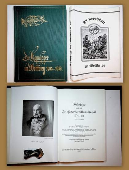 Geschichte des k. u. k. Feldj?gerbataillons Kopal Nr 10 : 1914-1918 ; Auf Grund von Niederschriften der Kommandanten des Battaillons, sonstiger Aufzeichnungen von Beteiligten, von Tageb?chern und Gefechtsberichten zsgest. u. bearb. Alfred Rost. Hrsg. vom Bund d. Kopalj?ger in Wien. Wien, Bund d. Kopalj?ger, 1938. original Leinenbandmit Kopffarbschnitt und Goldpr?gung mit original Schutzumschlag, gr.-8?, XXIV, 538 Seiten, Mit einer Ruhmestafel, 14 Kunstdr. Bildern u. 15 Taf., ferner im Text 112 Abb., 63 Skizzen, 5 Fig. u. e. Kriegsgliederg ; 4 + mit 15 Beil. in e. Tasche. komplettes Exemplar mit allen Beilagen, sehr guter Zustand nahezu verlagsfrisches Exemplar.